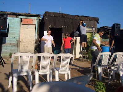 Money, clothes, toys, and food were collected to raffle off. We had enough to give away 5 bicycles, 20 boxes of food and 100 gift bags with candy and toiletries. Clothes were given to the families with the most need. We hung white Christmas lights and balloons from the houses and the wooden fence that surrounds the lot. A face paint station was set up for the kids. We ate tamales (incredible!), beans, cake & jello and had hot chocolate with cinnamon. A string ensemble from a local school came to give a concert. It was dynamic listening to violins play Christmas music against such a backdrop. Our group did a skit and the kid's sang songs they had been practicing for their parents.